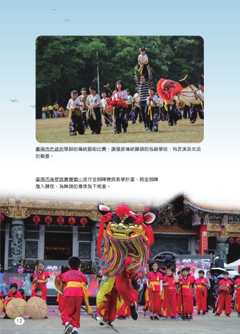 臺南市市政府舉辦的傳統藝術比賽,讓發展傳統陣頭的各級學校,有表演及交流 的舞臺。 臺南市後壁區菁寮國小進行金獅陣復興教學計畫,將金獅陣 融入課程,為陣頭的傳承紮下根基。 臺南竹仔港文化祭「金獅陣大會師」,邀請七隊西港香科的金獅陣一起同臺表演。 (作者:臺灣民間信仰影音數位平臺計畫-第四年) 陣頭不只是傳統技藝,同時 也是珍貴的文化寶藏,大家 一起來想想怎麼可以讓更多 人認識陣頭吧! 12 13