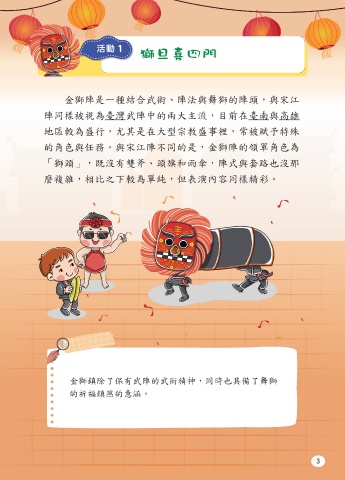 活動1 獅旦喜四門 金獅陣是一種結合武術、陣法與舞獅的陣頭,與宋江 陣同樣被視為臺灣武陣中的兩大主流,目前在臺南與高雄 地區較為盛行,尤其是在大型宗教盛事裡,常被賦予特殊 的角色與任務。與宋江陣不同的是,金獅陣的領軍角色為 「獅頭」,既沒有雙斧、頭旗和雨傘,陣式與套路也沒那 麼複雜,相比之下較為單純,但表演內容同樣精彩。 金獅鎮除了保有武陣的武術精神,同時也具備了舞獅 的祈福鎮煞的意涵。 3