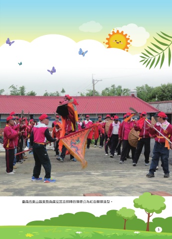 舞獅威風凜凜,讓陣 頭更熱鬧有看頭。 臺南市佳里區塭內蚶寮永昌宮金獅陣,有「寶島獅王」的美譽。 (攝影者:趙守彥) 臺南市東山區東勢角廣安宮金獅陣的獅爺公為紅面獅頭造型。 臺南市安南區郭岑寮聖岑宮金獅陣有獨特的奔跑擺陣、兵器招式及獅藝動作。 (攝影者:顏大鎰) 4 5