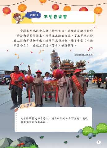 活動1 南管音樂會 臺灣有些地區會在廟宇神明生日、遶境或建醮活動時 ,聘請南管館閣演出,或是在王醮的祀王、宴王等重大祭 典上請南管擔任司樂。演奏的完整編制,除了十音(十種 樂器合奏),還包括宮燈、涼傘、彩牌旗等。 (提供者:黃文博校長) 大發現 南管陣的歷史相當悠久,演出的形式大多可分為:載歌 載舞與只歌不舞兩種。 0 3