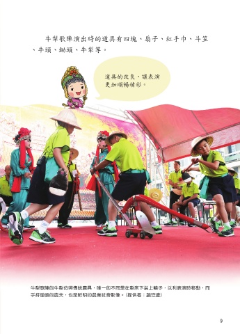 旦的服裝延續漢人的傳統服飾,可搭配不同顏色的繡 牛犁歌陣演出時的道具有四塊、扇子、紅手巾、斗笠