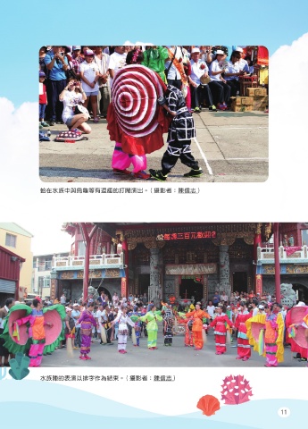 大鵬鳥、白鷺鷥的武器對打。( 攝影者:陳信志 )  水族陣的表演以排字作為結束。( 攝影者:陳信志 )