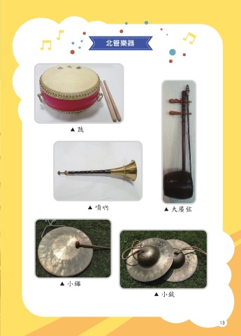 活動3 水族陣的武棚 北管樂器 西港南海埔水族陣的武棚(後棚)以北管作為前導 與伴奏,樂器有鑼、鼓、鈸、嗩吶、大廣弦等。北管的 音樂是節奏強烈、聲音宏亮的鑼鼓演奏,充滿熱鬧豪邁 的風格,最能襯托出節慶的熱烈氣氛。 ▲ 鼓 水族陣行進時以北管伴奏引導。 ▲ 嗩吶 ▲ 大廣弦 ▲ 小鑼 ▲ 小鈸 12 13