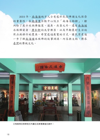 文物館裡的對聯是庄內書法名家黃華堂的創作。                                                                                        南海文物館展示水族陣的道具、衣物與兵器。