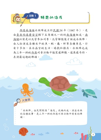 活動1 稀奇的海反 西港南海埔水族陣成立於民國 56 年(1967 年),是 由臺南西港慶安宮轄下五角頭之一的的南海埔組成。南 海埔以前是以北管參加刈香,北管解散後才組成水族陣, 由人扮演成各種水中的魚、蝦、龜、蚌等各種角色,計 有十多位,在水晶宮的生活、嬉戲和操兵。水族陣也成 為三年一科的西港刈香活動中服裝最鮮艷、道具最奇特、 表演最逗趣的陣頭。 大發現 大發現 「水族陣」由民間歌謠「海反」改編而成,演出水族 的各種故事。是三年一科的西港刈香活動中特有的陣 頭。 3