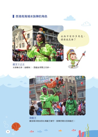 ▌西港南海埔水族陣的角色 白鷺鷥 白鷺鷥、海鳥是眾水族的大敵, 水族中有許多角色, 而白鷺外型優雅,動作靈巧。( 攝 猜猜我是誰? 影者:林昇輝 ) 龍王三公主 水族陣主帥 ( 金鯉魚 ),是龍宮領軍之元帥。 龜丞相、鱟婆 龜丞相與鱟婆為夫妻角色,也是 水族陣中的甘草人物。( 攝影者: 林昇輝 ) 海龍王 據說海洋是由四位海龍王鎮守,即東西南北四海龍王。 4 5