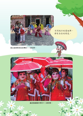 活動2 婆娑起舞 傳統的婆姐陣大多分布於臺南市,現存以新營十二婆 祖陣創立最早,另外還有麻豆南勢保安宮、灣裡同安宮、 六甲甲東社區、學甲宅港社區、新營民榮社區、麻豆南勢 不同地方的婆姐陣, 都有各自的特色。 社區等廟宇或社區成立婆姐陣,近年也新增專業舞蹈表演 的團體類型,如新生代舞蹈團。 學甲區宅港社區的十二婆姐陣。 麻豆區南勢保安宮傳統十二婆姐陣。 麻豆區南勢社區的十二婆姐陣。 12 13