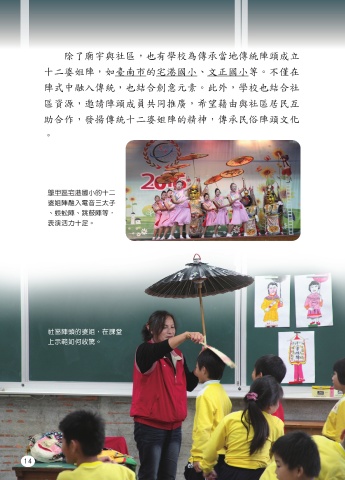 除了廟宇與社區,也有學校為傳承當地傳統陣頭成立 十二婆姐陣,如臺南市的宅港國小、文正國小等。不僅在 陣式中融入傳統,也結合創意元素。此外,學校也結合社 區資源,邀請陣頭成員共同推廣,希望藉由與社區居民互 助合作,發揚傳統十二婆姐陣的精神,傳承民俗陣頭文化 。 學甲區宅港國小的十二 婆姐陣融入電音三太子 、蜈蚣陣、跳鼓陣等, 表演活力十足。 社區陣頭的婆姐,在課堂 上示範如何收驚。 14