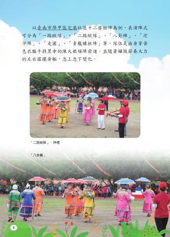 以臺南市學甲區宅港社區十二婆姐陣為例,表演陣式 可分為「一路縱隊」、「二路縱隊」、「八卦陣」、「卍 字陣」、「走圓」、「青龍纏柱陣」等,隊伍是由身穿黃 色衣服手持黑傘的陳大娘領陣前進,並隨著鑼鼓節奏大力 的左右搖擺身軀,忽上忽下變化。 「卍字陣」—十全十美 「青龍纏柱陣」—祥龍獻瑞 「二路縱隊」—拜禮 「八卦陣」 8 9
