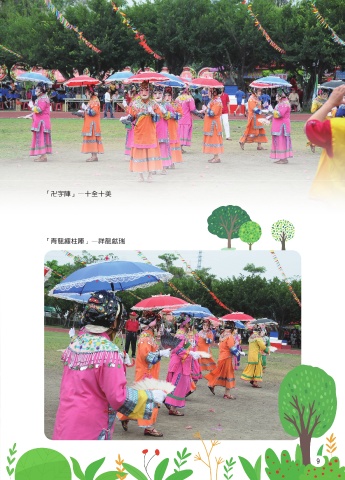 字陣」、「走圓」、「青龍纏柱陣」等,隊伍是由身穿黃