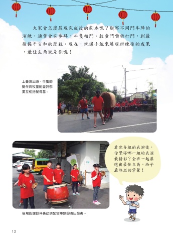 大家會怎麼展現完成後的劇本呢?觀察不同鬥牛陣的 演練,通常會有參拜、牛隻相鬥、牧童鬥嘴與打鬥,到最 後握手言和的歷程。現在,就讓小組來展現排練後的成果 ,最佳主角就是你喔! 上臺演出時,牛隻的 動作與牧童的臺詞都 要互相搭配得當。 看完各組的表演後, 你覺得哪一組的表演 最精彩?全班一起票 選出最佳主角,給予 最熱烈的掌聲! 後場的鑼鼓伴奏必須配合陣頭的演出節奏。 12