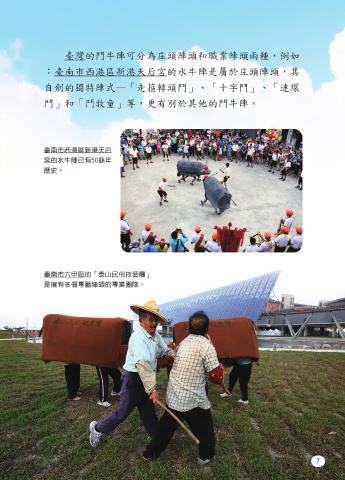 臺灣的鬥牛陣可分為庄頭陣頭和職業陣頭兩種,例如 鬥牛陣後場樂器 :臺南市西港區新港天后宮的水牛陣是屬於庄頭陣頭,其 自創的獨特陣式―「走箍轉頭鬥」、「十字鬥」、「連環 鬥」和「鬥牧童」等,更有別於其他的鬥牛陣。 臺南市西港區新港天后 宮的水牛陣已有50餘年 歷史。 ▲ 鈸 ▲ 鼓 臺南市六甲區的「泰山民俗技藝團」 是擁有多個專屬陣頭的專業團隊。 ▲ 鑼 6 7